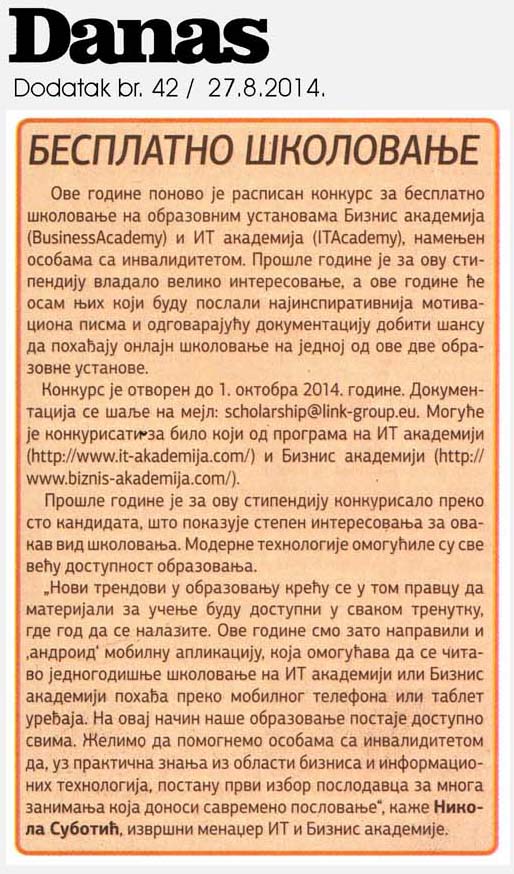 BusinessAcademy, međunarodna škola za poslovnu edukaciju kompanije LINK group, buduće preduzetnike uči svim onim veštinama koje će im biti potrebne za uspeh na poslu i u samostalnom radu...